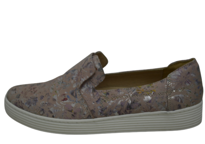 Obuv je celokožená mokasínka s gumičkou v nártu,je nádherně barevně sladěná růžovo/stříbrná s mírným leskem.Obuv je lehká a dostatečně široká s tvarováním na klenek.Je flexibilní (přišitá podešev a svršek).Tato obuv poskytuje komfort pro každenní nošení.Doporučená údržba je impregnace.