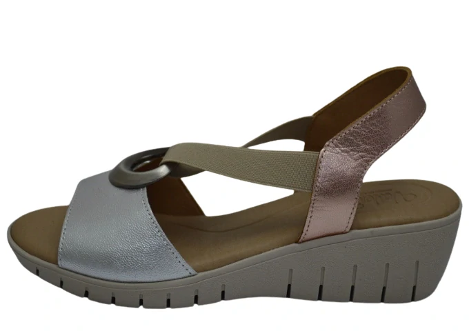 Kožené,elegantní dámské sandály na klínku vysokém 5cm.Přes nárt ke kotníkům vede gumička pro pohodlnější obutí .V nártové čáti je kovová ozdoba.Stélka je kožená,velice příjemně měkká.