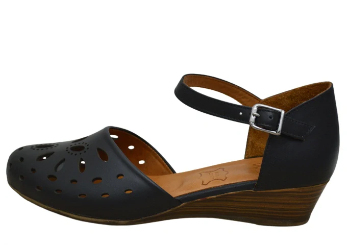 Dámská perforovaná obuv, vyrobená z hladké kůže, vnitřek obuvi tvoří kožená podšívka a vyměkčená kožená stélka. Snadné nazouvání zajišťuje nastavitelný pásek okolo kotníku.Pod patou klínek 3,5 cm.