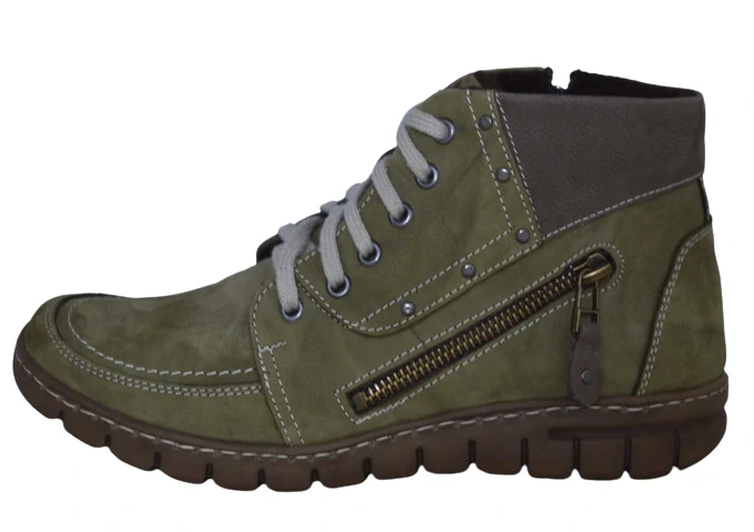 Dámská kotníková,zimni obuv.Boty jsou vyrobeny z nubukové kůže.Stélka je zateplena.Šněrování je na klasické tkaničky a zároveň na zip z vnitřní strany boty.Z vnější strany boty je okrasný zip.Boty jsou vhodné k běžnému a každodennímu nošení..Doporučená údržba je impregnace.