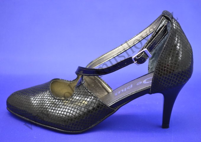 Obuv společenská je celokožená s lakovanou povrchovou úpravou,výška podpatku je 6,5cm,zapínání je v překříženém pásku přes nárt.Obuv má plnou špici a patu.Stélka pod prsty je vyměkčená a perforovaná,tím je došlap příjemnější.Náhradní patníky jsou přiloženy v krabičče.
